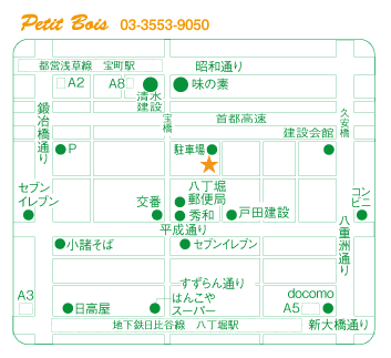 | 道案内 | 地下鉄日比谷線 八丁堀駅 A5出口徒歩3分/JR京葉線 八丁堀駅 B1出口徒歩4分/地下鉄都営浅草線 宝町駅 A2出口徒歩4分/地下鉄銀座線 京橋駅4番出口徒歩5分/日本橋駅 徒歩10分/東京駅 徒歩13分/銀座駅 徒歩15分/有楽町駅 徒歩17分 |